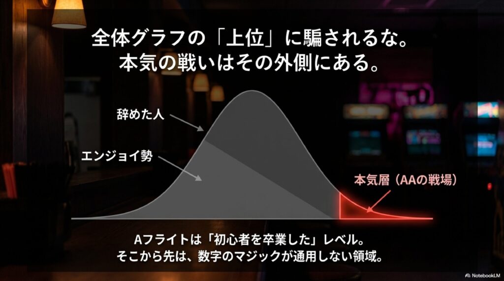 公式が出しているフライトの分布グラフは、あくまで「全体の話」。そこには、途中でやめた人やエンジョイ勢も多数含まれています。
