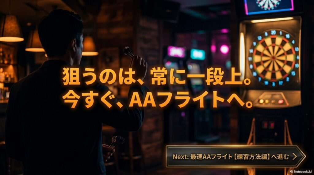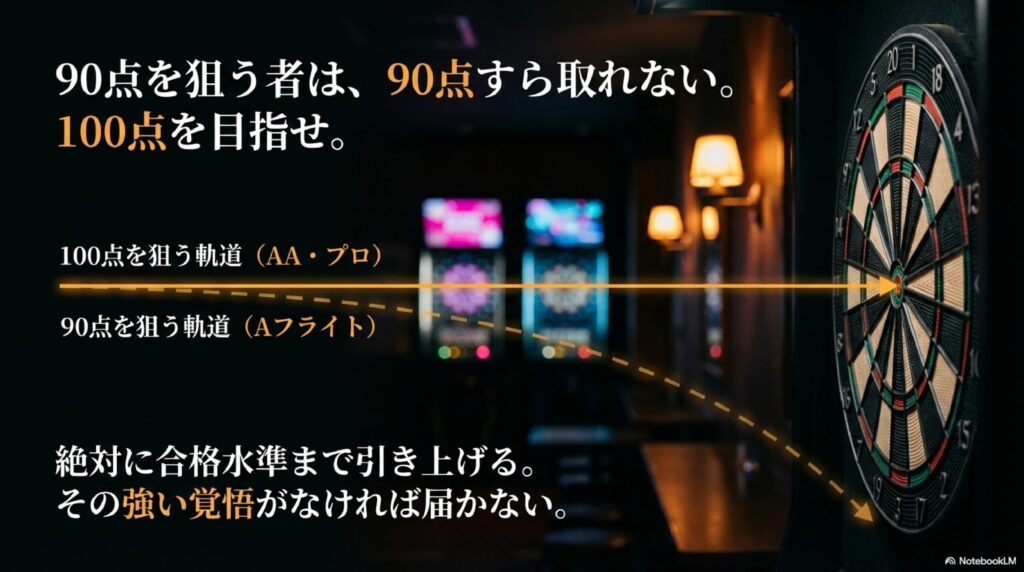 90点(Aフライト)を狙うんじゃなくて、100点(AAフライト、あるいはプロ)を本気で目指す。その姿勢こそが、ダーツでも人生でも一番大事なんです。