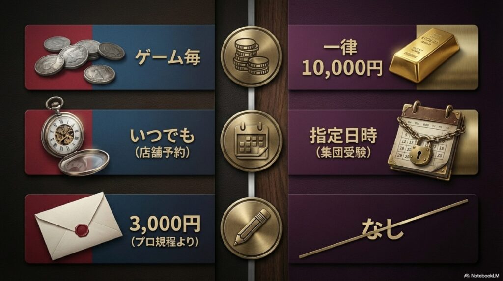 | 実技受験料 | ゲームごとにお金が発生 | 10000円(再受験5000円) |