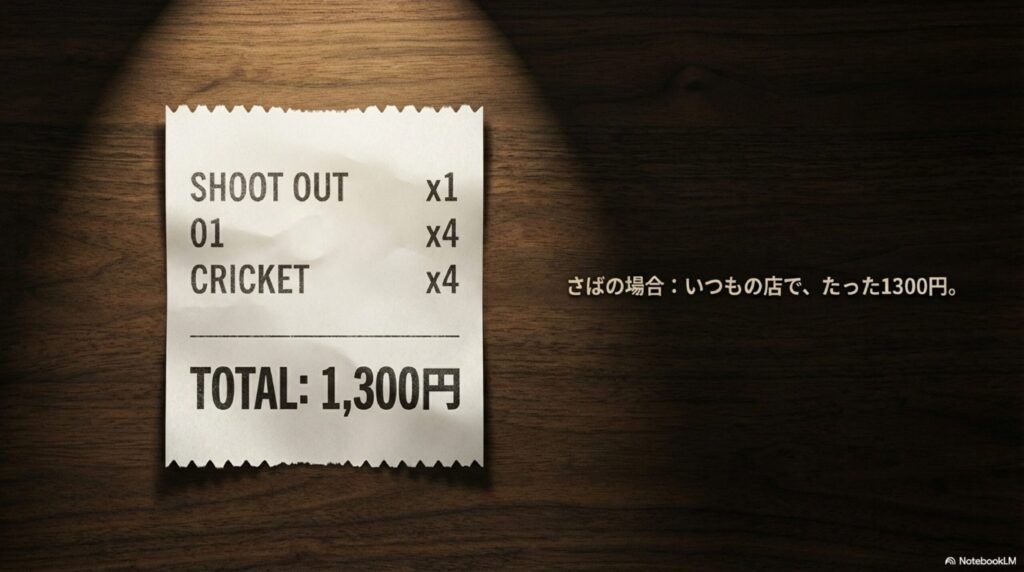 | お金 | 学生だったから、とにかく出費を抑えたかった。 結果として、シュートアウト1回・ゼロワン4回・クリケットカウントアップ4回で合計1300円! 01だけ「200円かかる」って言われて一瞬ビビったけど、それもいい緊張感だった😂 |