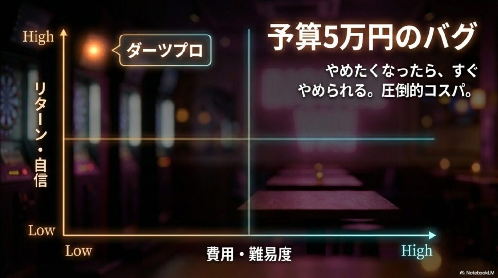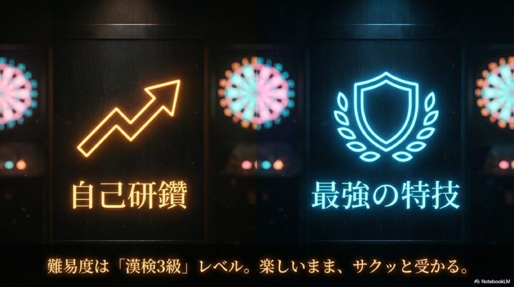 僕の感覚では、難易度は“漢検3級”くらい。正しい方法でちゃんとやれば、誰でも届くレベルです。しかも、ダーツを知らない人にとっては「え、プロ!? すごっ!」ってリアクションがもらえる、コスパ最強の特技です。