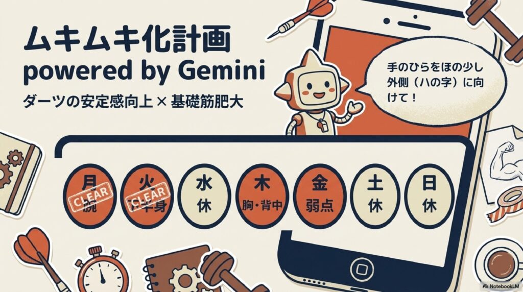 今週はダーツの安定性向上と、基礎的な筋肥大を狙った構成です。