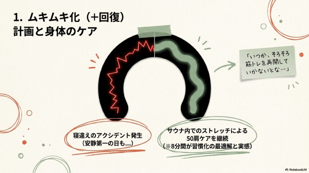 • サウナ習慣の定着: サウナでしっかり50肩ストレッチを実施(8分という時間がちょうどよく習慣化を実感)(4/16)