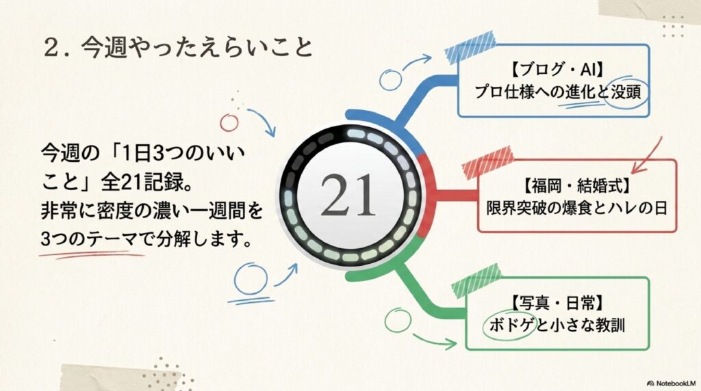 今週の「1日3つのいいこと」全21記録です ブログのプロ仕様化から福岡遠征まで、非常に密度の濃い一週間でした