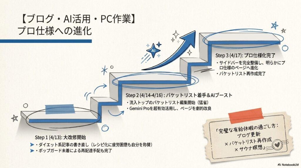• プロ仕様への進化: ブログのサイドバーを完全にきれいにし、明らかにプロ仕様のページになって歓喜(4/17)