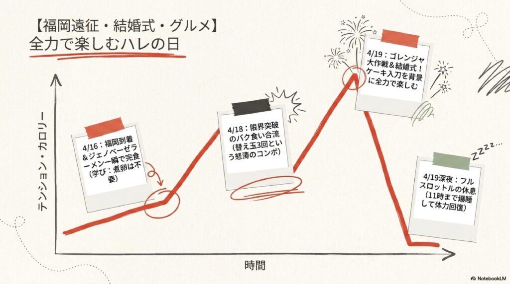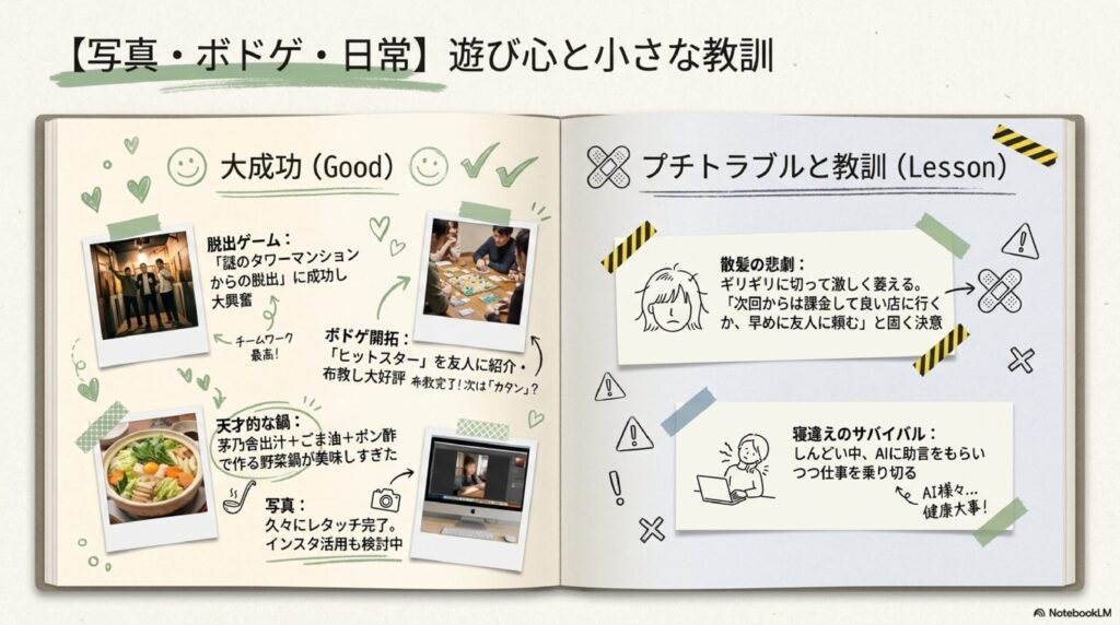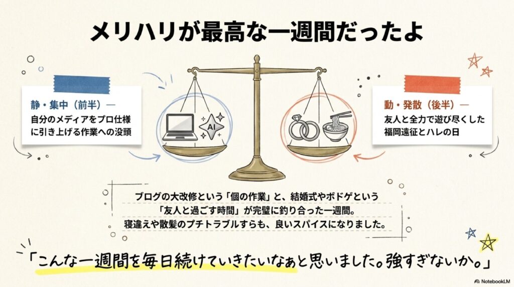 前半はブログの大改修やGemini Proの活用など、自分のメディアをプロ仕様に引き上げる作業に没頭できました 後半は福岡での有給休暇から始まり、怒涛のバク食い、脱出ゲーム、そして大盛り上がりの結婚式と、友人と過ごす時間を全力で楽しめました 寝違えや散髪のプチトラブルもありましたが、トータルで見れば完璧に充実した一週間です。
