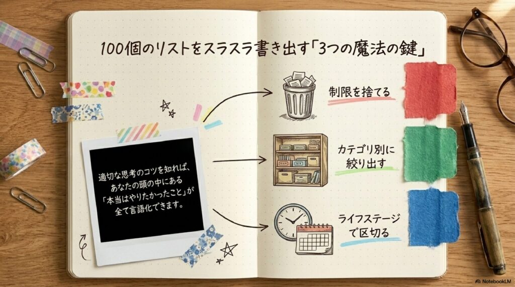 ここでは、私が実際に100個以上のリストをスラスラと書き出し、さらにそれらを実行に移すために使った「3つの思考法」を伝授します。