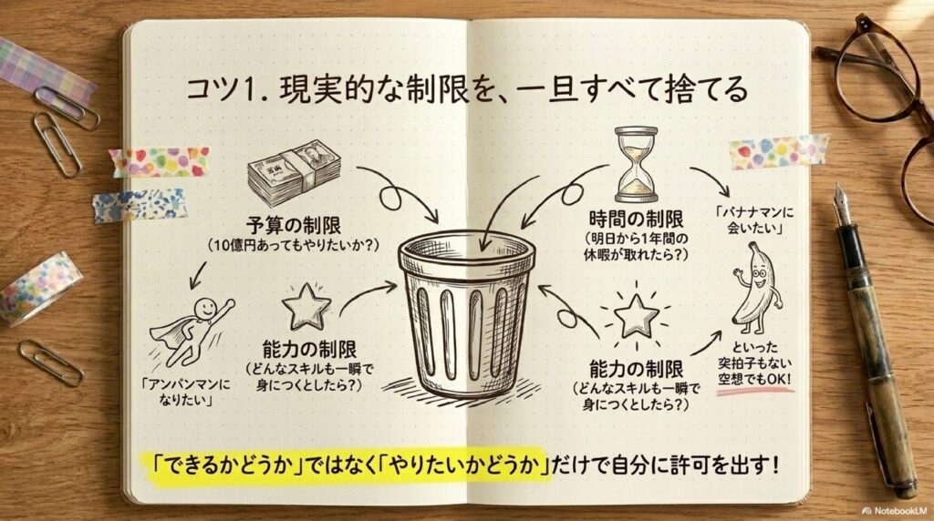 コツ1. お金や時間の「現実的な制限」を一旦すべて捨てる
