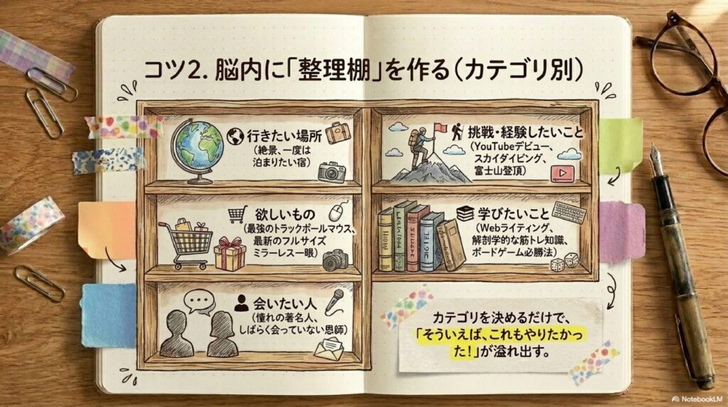 カテゴリを決めるだけで、芋づる式に「そういえば、これもやりたかった!」というアイデアが溢れ出してくるはずです。