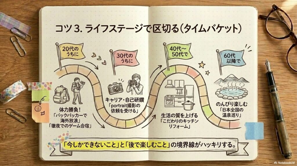 それでもリストが埋まらない時は、視点を「自分の一生」という長い時間軸に移してみましょう。これが私の推奨する「タイムバケット」の考え方です。