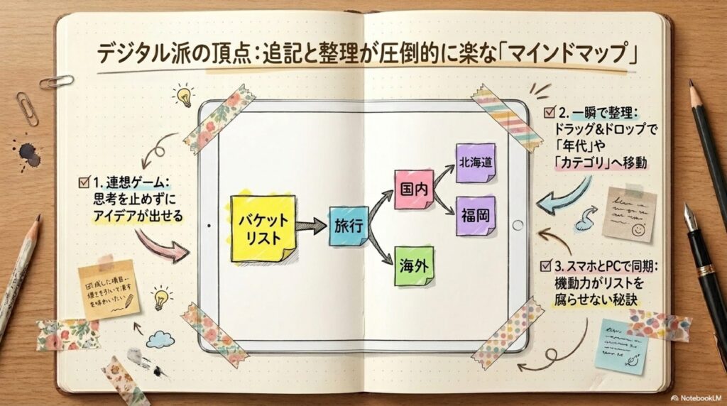 - スマホとPCで同期できる:通勤中にふと思いついた「やりたいこと」をその場でメモし、自宅のPCでじっくり深掘りする。この機動力がリストを腐らせない秘訣です。