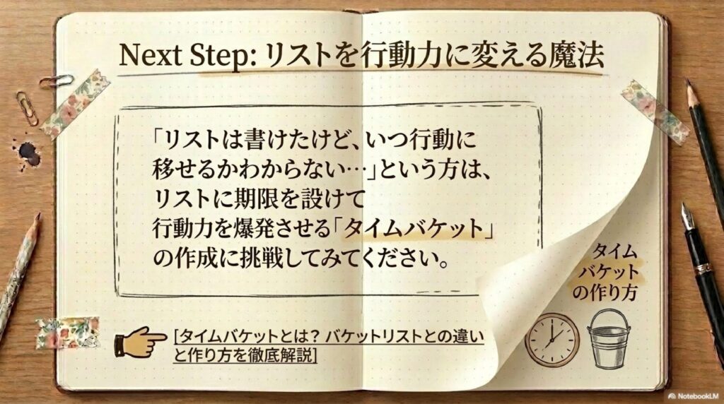 👉 [リンク:タイムバケットとは?バケットリストとの違いと作り方を徹底解説]