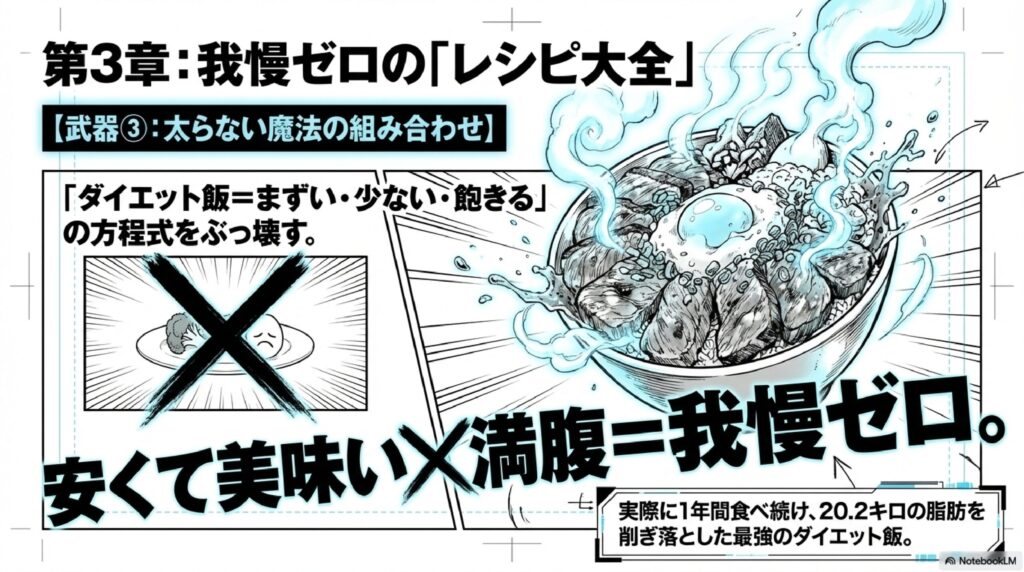 「満足するまで食べても太らない魔法の組み合わせ」と、実際に僕が1年間食べ続けていた、安くて美味しくて簡単に作れるレシピをすべて公開します。