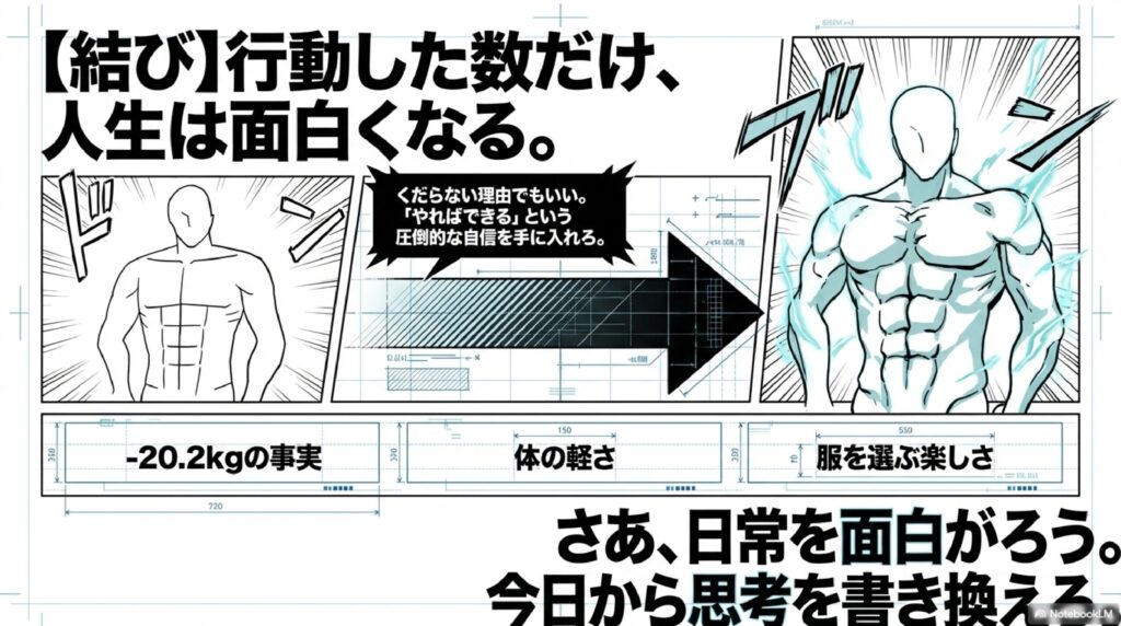 そんなくだらない理由から始まった僕のダイエットでしたが、結果として20.2キロ痩せたことで、体の軽さ、服を選ぶ楽しさ、そして「やればできる」という圧倒的な自信を手に入れました。