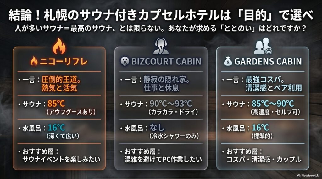 本ページでは、札幌を代表するカプセルサウナ3施設を徹底比較してきました。 サウナに求めるものは人それぞれ。だからこそ、「誰かが良いと言っていたから」ではなく、自分の目的に合わせて宿を選ぶことが大切です。