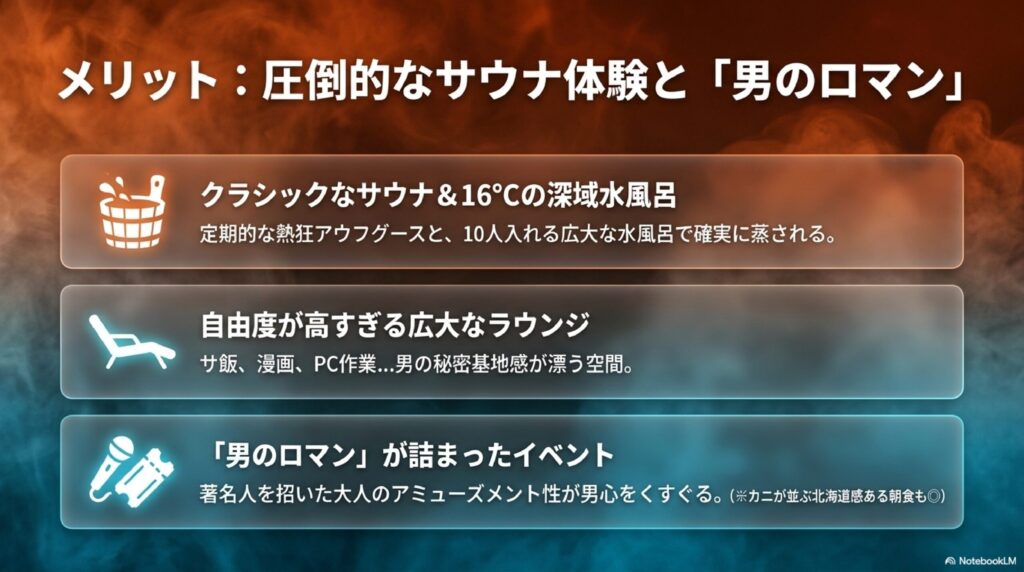 メリット:圧倒的なサウナ体験と「男のロマン」