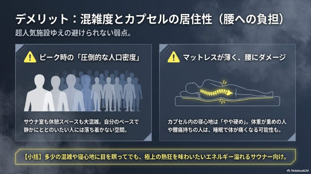 デメリット:混雑度とカプセルの居住性(腰への負担)