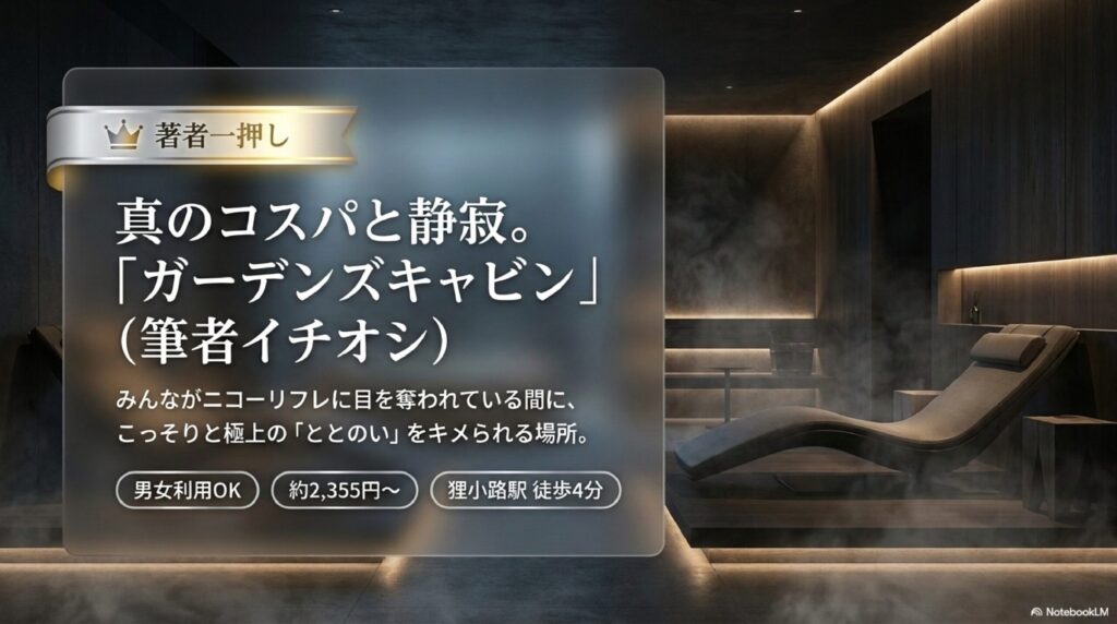 確かにニコーリフレは素晴らしい名門サウナです。しかし現在のサウナブームにより、「常に人が多くて落ち着かない」「自分のペースでととのえない」と感じているサウナーが増えているのも事実。