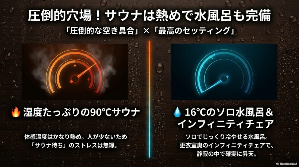 サウナ室の温度計は90℃ですが、湿度が高く保たれているため体感温度はかなり熱めです。収容人数は少ないものの、そもそも人が少ないため「サウナ待ち」のストレスとは無縁。16℃の水風呂は少し狭いですが、ソロでじっくり冷やせるので全く問題ありません。浴室内に5席、更衣室奥にはインフィニティチェアも1席完備されており、静寂の中で確実に昇天できます。