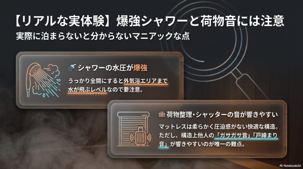 一方で、超人気施設ゆえの避けられない弱点と、宿泊時の明確な注意点があります。