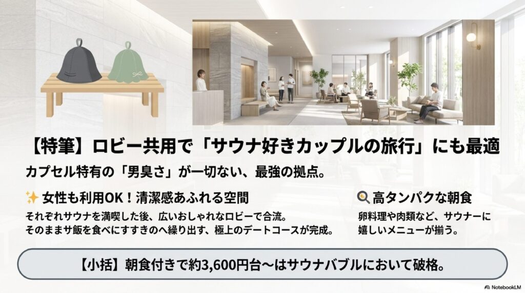 【特筆】ロビー共用で「サウナ好きカップルの旅行」にも最適