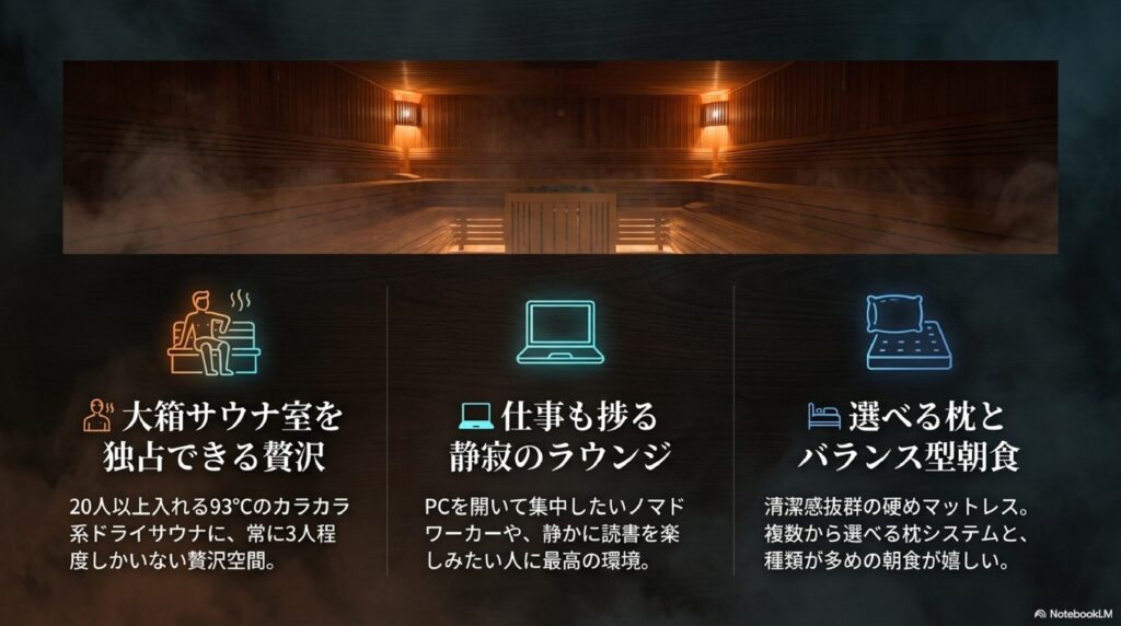 ここは「ととのい」の質よりも、「人混みを避けた静かな時間」と「快適な宿泊環境」を最優先したい人に向けた特化型の施設と言えます。
