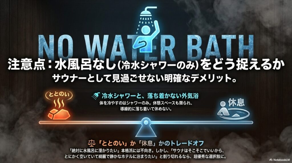 ただし、サウナーとして見過ごせない明確なデメリットが一つあります。それは「水風呂が存在しない」ことです。