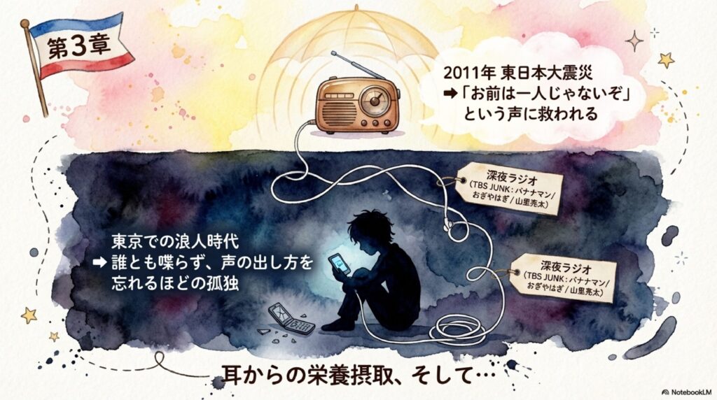 後半は、さばの異常なまでの「ラジオ愛」と壮絶な過去が語られます。 東日本大震災の際、ラジオから聞こえる「お前は一人じゃないぞ」というパーソナリティの言葉に、遠く離れた福岡に住むさばも強く救われたと言います。その熱量は、高校の修学旅行で班員を説得し、なんとTOKYO FMへ企業見学に行くほど。