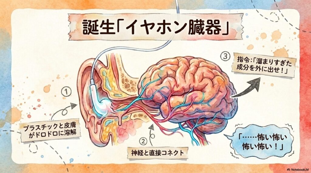 さば「ずーっとイヤホンをつけて人の声を取り込み続けた結果、皮膚とプラスチックが溶けて神経と繋がり、イヤホンが俺の新しい臓器になっちゃったんだよ」