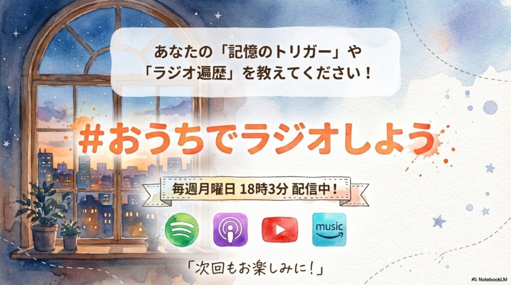 番組へのご感想をお待ちしています! 「この曲を聴くとあれを思い出す!」「あの匂いは青春の香り!」といったエピソードや、あなたのラジオ遍歴をぜひ教えてください。X(旧Twitter)にて「#おうちでラジオしよう」をつけてポストしてくださいね。