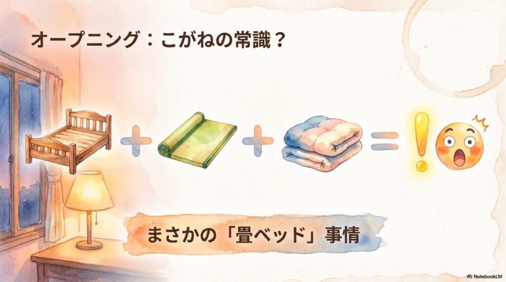 すのこベッドならぬ、まさかの「畳ベッド」で育ったこがね。そんなクスッと笑えるオープニングから、今回は少し真面目な人間関係のモヤモヤと、コミュニケーションの深い話へと展開していきます。