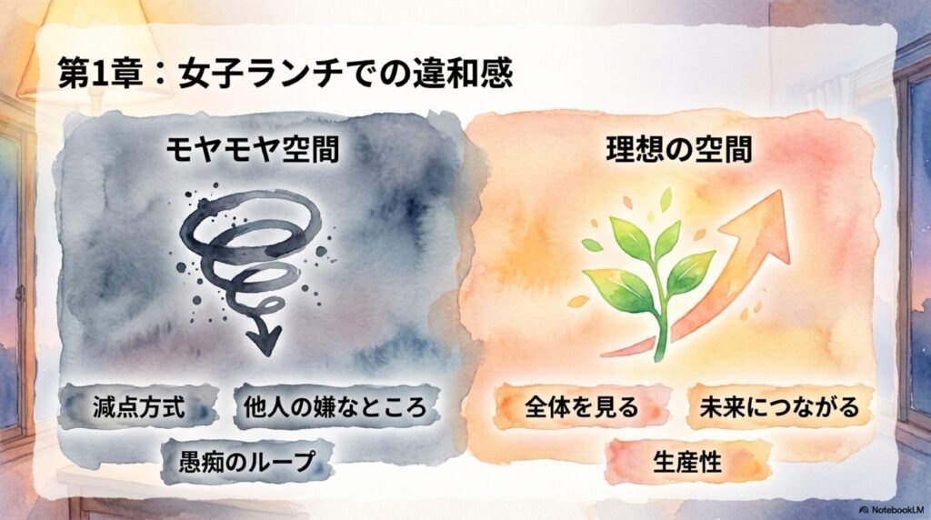 こがね「私は人の嫌なところだけで判断したくないの。その人の全体を見たいし、同じ愚痴をループするんじゃなくて、会話は未来につながる生産性のあるものにしたいって思っちゃうんだよね」