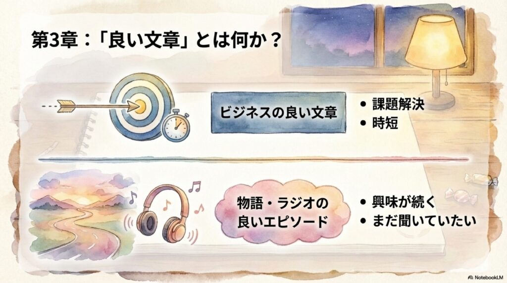 そんな大脱線もありつつ、研修で学んだ「良い文章とは何か」というテーマは、さばの胸に強く刺さりました。 ビジネスにおける良い文章とは、読み手の状況を考え、問題を解決して時短になるもの。一方で、小説や物語における良い文章とは「続きが読みたくなる、興味がずっと続くもの」だと教わったそうです。