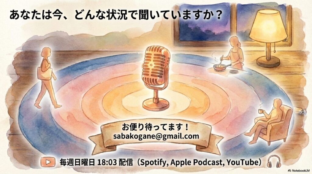 番組への感想や、「今こんな状況で聞いてるよ!」というお便りは、以下のメールアドレスまでお待ちしています。 【宛先】sabakogane@gmail.com(すべてローマ字です)